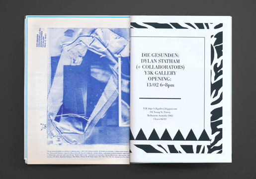 Over two-years Y3K exhibited World Food Books, BLESS, Christopher L.G. Hill, Emmeleine deMooij, Jota Castro, Kinga Kielczynska, Melanie Bonaj, fabrics interseason, ffiXXed, Heinz Peter Knes, James Deutsher, Matt Hinkley, Olivia Barrett, Pat Foster, Jen Berean, Rob McKenzie, SIBLING, Slow and Steady Wins the Race, Jon Campbell, LOST Projects, Alex Vivian, Daniel du Bern, Nick Selenitsch, Kain Picken, Next Wave, A Constructed World, Joshua Petherick, Helen Johnson, Bianca Hester, Misha Hollenbach, David Griggs, Sam Kiyoumarsi, Robert Langenegger, Nick Mangan, Matt Griffin, Masato Takasaka, Fiona Connor, Tahi Moore, Ida Ekblad, Art Centre Ongoing, Kit Lee, Kate Newby, Sriwhana Spong, Dylan Statham, Simon Taylor, Sophia Mitchell, Rowan Mcnaught, MM Yu. Ilia Farah Rosli, Marco Fusinato, TATE Modern, Marie Gaultier, Anna Hess, Veronica Kent, Jarrod Rawlins, Keith Al-Hasani, Ruby Lowe, Justin Clemens, Daniel Munn, Simon Denny, Dan Arps, Andrew Barber, Structural Integrity, Marco Fusinato, Rose Nolan, Dan Bell, Kate Smith, Ardi Gunawan, Nikos Pantazopoulos, Ben Tankard, Steve Kado, Virginia Overell, Mateo Tannatt, Sean Peoples, Inri Cristo, Tara Rawlins, Chateau 2F, Oscar Yanez, Hany Armanious, Ash Kilmartin, Elizabeth Gower, Lizzy Newman, Nina Sers, Maria Kozic, Ellen Pittman, Juan Davila, Janet Burchill, Jennifer McCarthy, Constanze Zikos, Hao Guo, Pow Martinez, Carissa Rodriguez, Tobias Kaspar, Piotr Łakomy, Natalie Rognsøy, Katherine Huang, Taree McKenzie, Ester Partegas, Mikala Dwyer and John Spiteri and more.