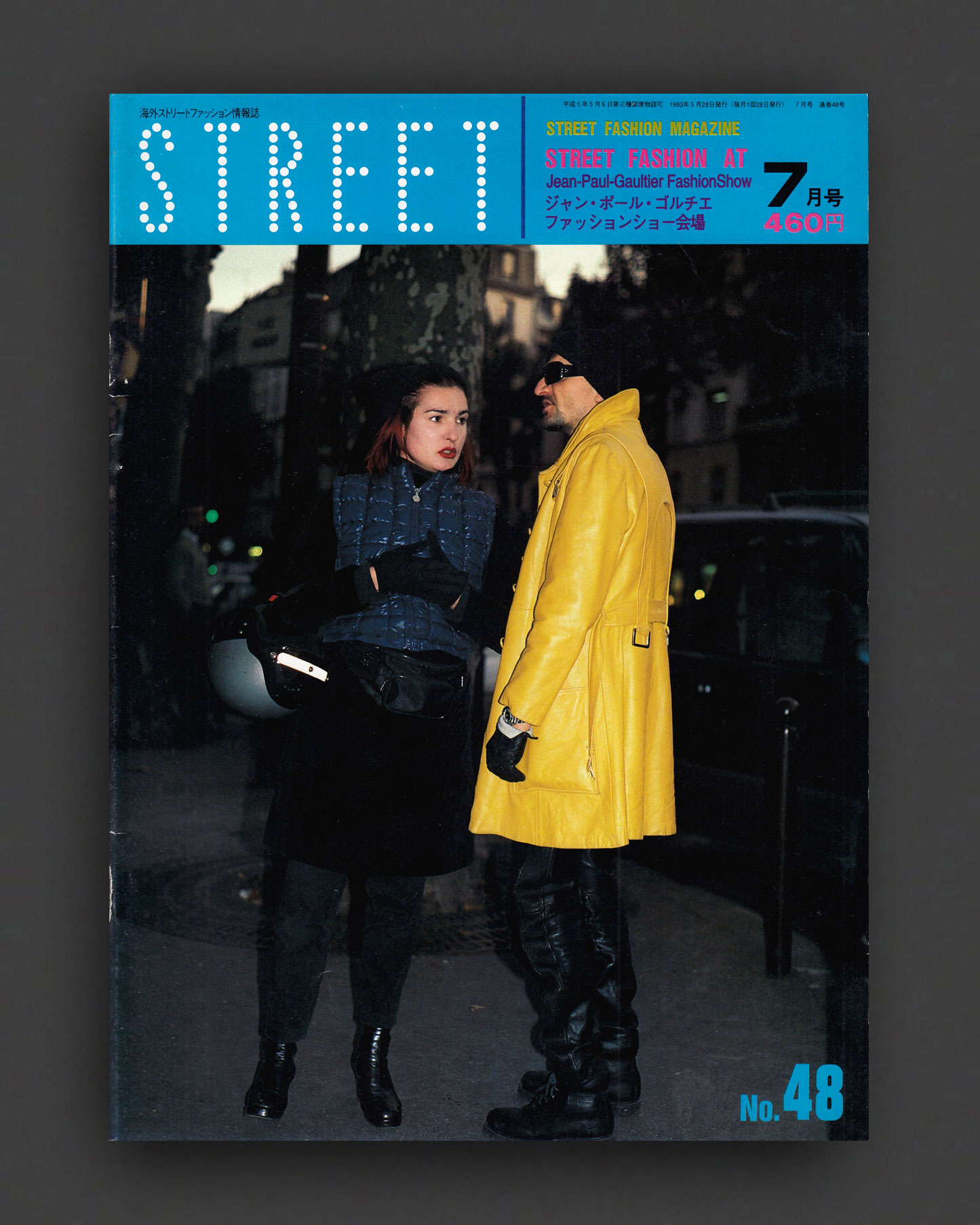 1993 issue of the iconic STREET magazine from Japan. No. 48 "Street Fashion at Jean-Paul Gaultier : July 1993". Every issue is entirely full-bleed pages of photographs by legendary Japanese street style photographer Shoichi Aoki. For this special issue centered on Jean-Paul Gaultier, Aoki focuses on the expressive, avant-garde looks of attendees and insiders surrounding the designer’s world, capturing the creative energy pulsing outside the runway. Aoki's Street (and later also Fruits) are essential style goldmines, creating valuable photographic documents of the times like no other magazine.