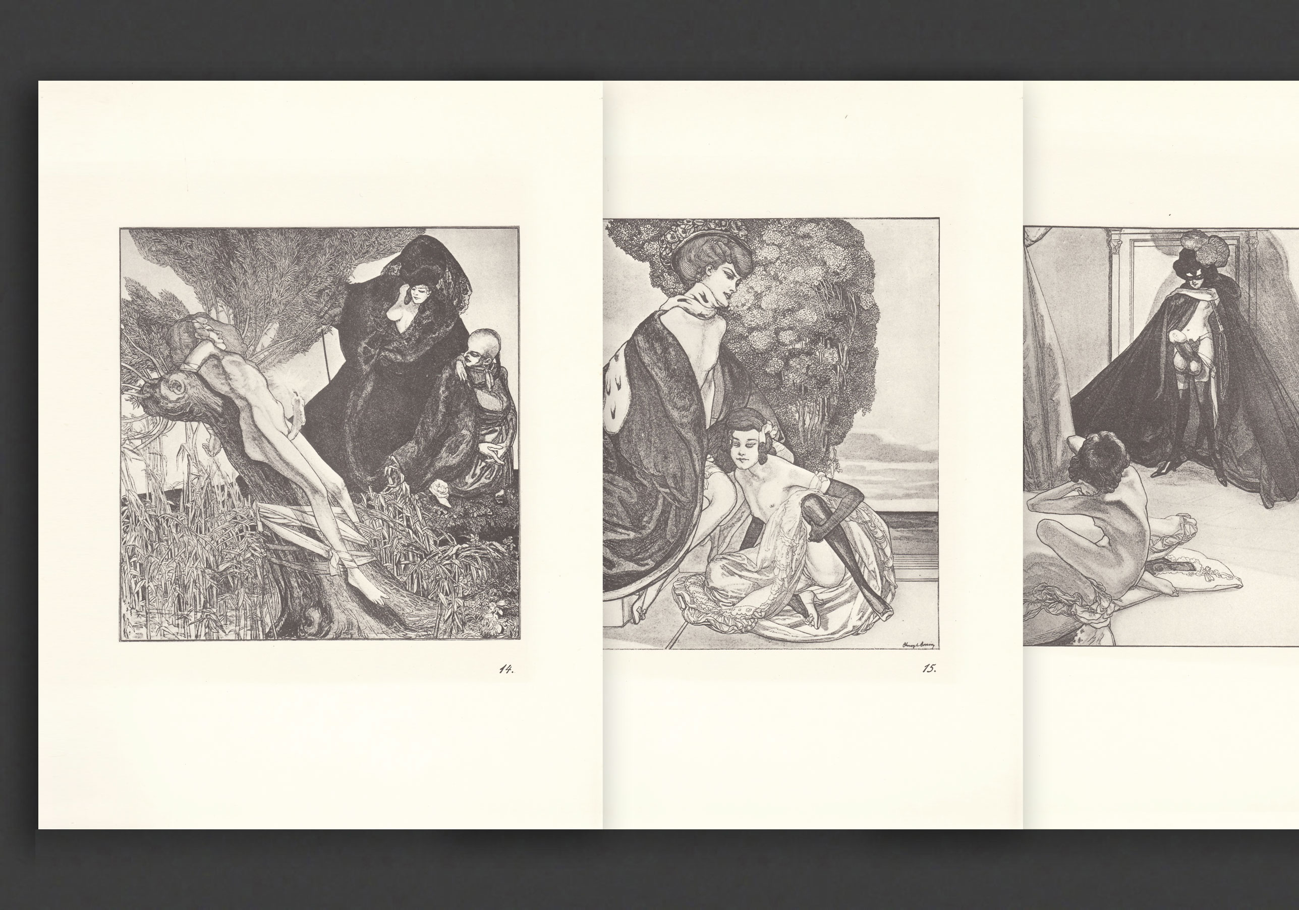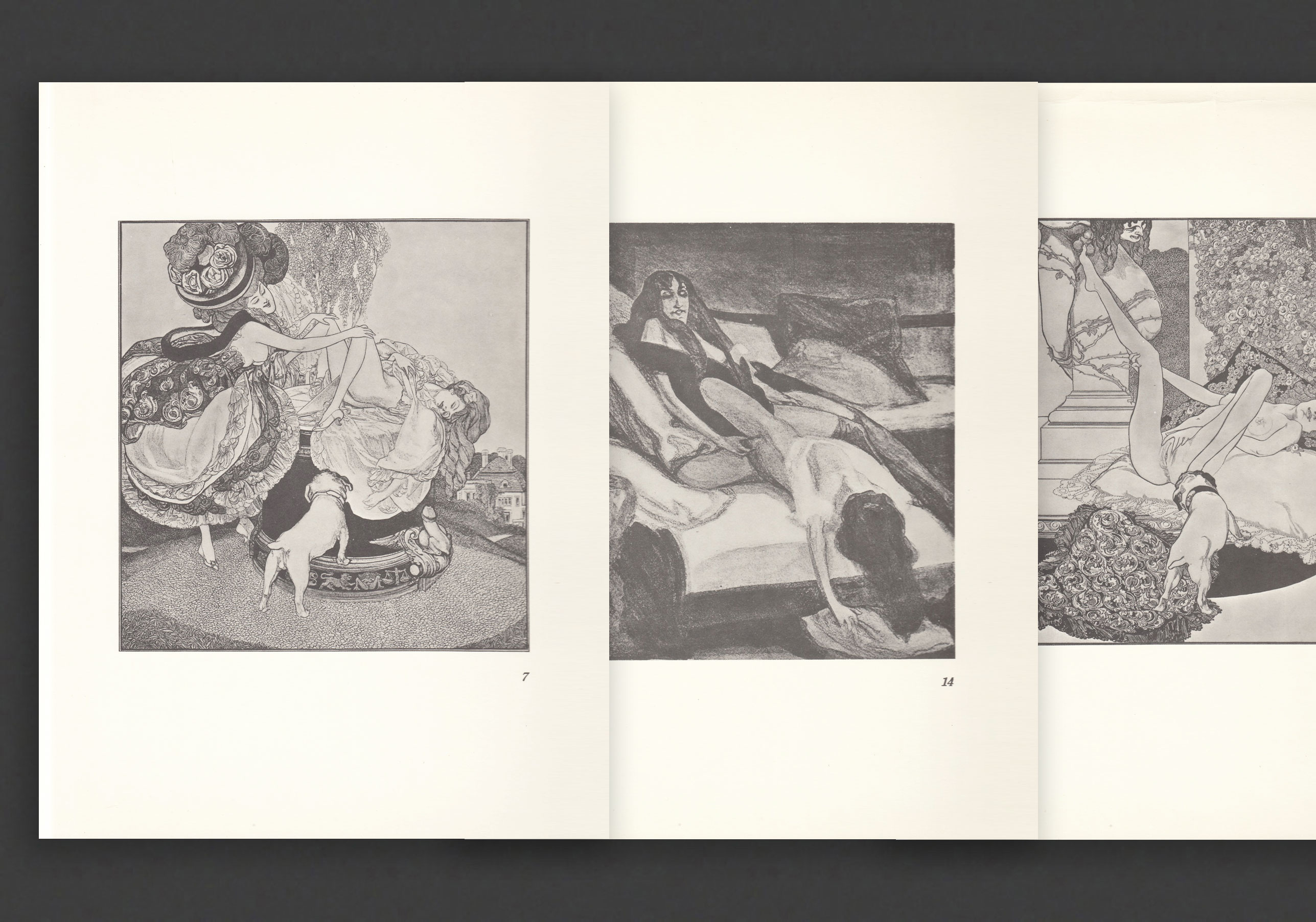 First hardcover editions of both erotic art book collections of Franz Von Bayros, published by Gakutokan, Tokyo, 1979 and 1980. Born in Zabreb, Croatia, Franz von Bayros (1866–1924) was an Austrian commercial artist, illustrator and painter. A leading figure in the Decadent artistic movement, his work challenged Victorian modesty, exploring phantasmagoric imagery and taboo erotic themes such as lesbian relationships, bestiality and sado-masochism, coupled with a keen sense of humour and warmth given to the subject. Franz’s brilliant draughtsmanship, design sense and his carefully-considered erotic imagination made his work eminently approachable and desirable, both as high-quality art and as a vehicle for exploring the limits of sexual experience, yet the scandalous nature of his work led to his arrest and temporary exile from Germany in 1911, returning to an Austria to face the outbreak of war and alienation.