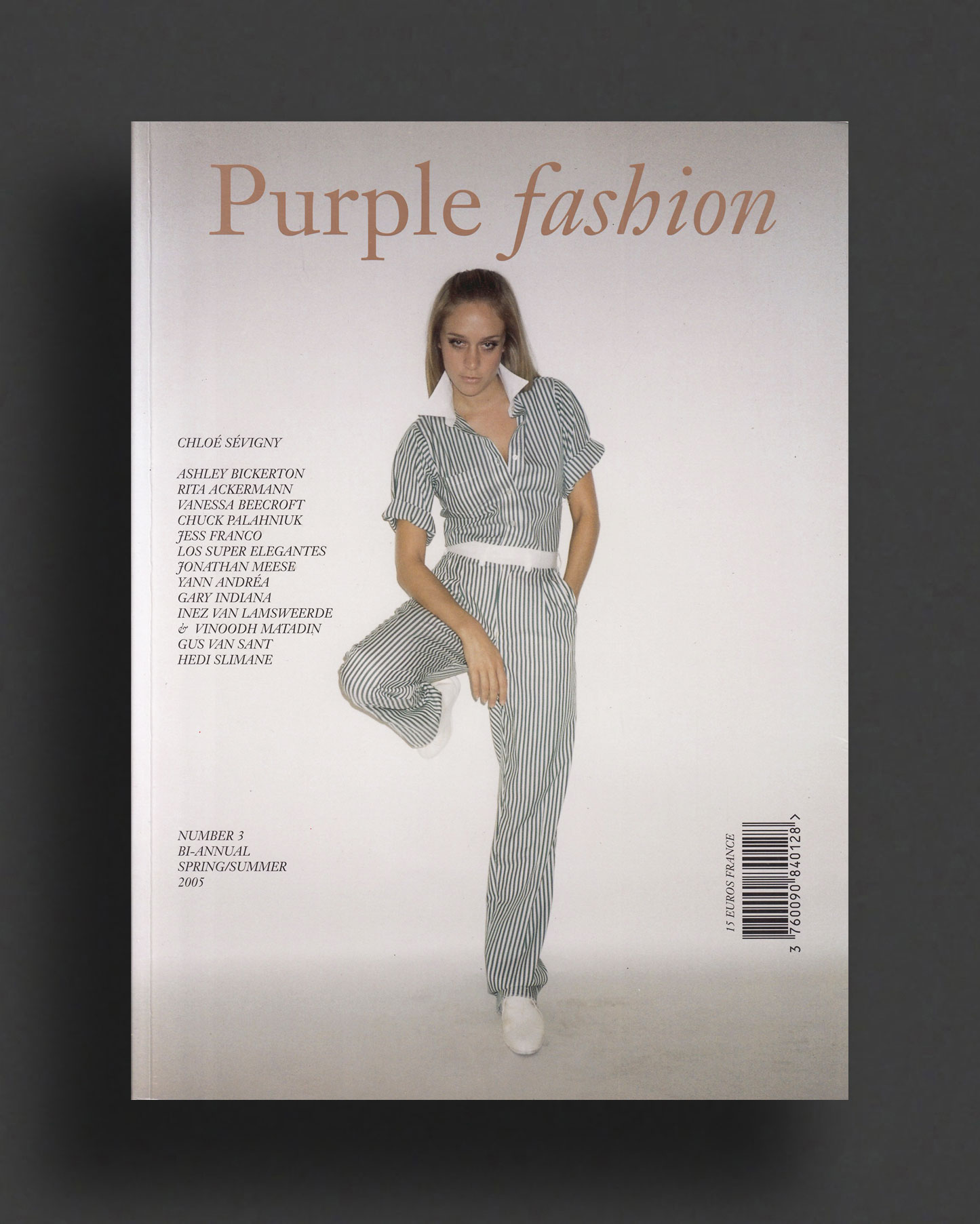 Now scarce copy of the third Purple Fashion, Spring / Summer 2005, edited by Olivier Zahm, with cover and major photo feature by Terry Richardson featuring Chloé Sévigny (styled by Katja Rahlwes), loads more photography by both Terry Richardson and Katja Rahlwes, plus Rita Ackermann, Jess Franco, Marguerite Duras, Gary Indiana, Gus Van Sant, Hedi Slimane, Camille Vivier, Vanessa Beecroft, Ashley Bickerton, Jonathan Meese, Bernadette Corporation, Martynka Wawrzyniak, Anette Aurell, Chuck Palahniuk, Helmut Lan, Rick Owens, Sonia Rykiel, Los Super Elegantes by Pablo León de la Barra, Yann Andréa, Helmut Lang, Inez Van Lamsweerde & Vinoodh Matadin, Comme des Garçons, Imitation of Christ, Lutz, Ann Demeuelemeester, Balenciaga, Alex Antitch, Giasco Bertoli, Marcelo Krasilcic, Vanina Sorrenti, Bless, Gaspard Yurkievich, Dries Van Noten, Miu Miu, Tsumori Chisato, Vanessa Bruno, Jean Paul Gaultier, Pierre Even, Christophe Brunnquell, Vava Ribeiro, Marcelo Krasilcic, Andro Wekua, Takashi Homma, Dike Blair, JNeff Rian, Miltos Manetaas, Antek Walczak, Laetitia Benat, and many more.