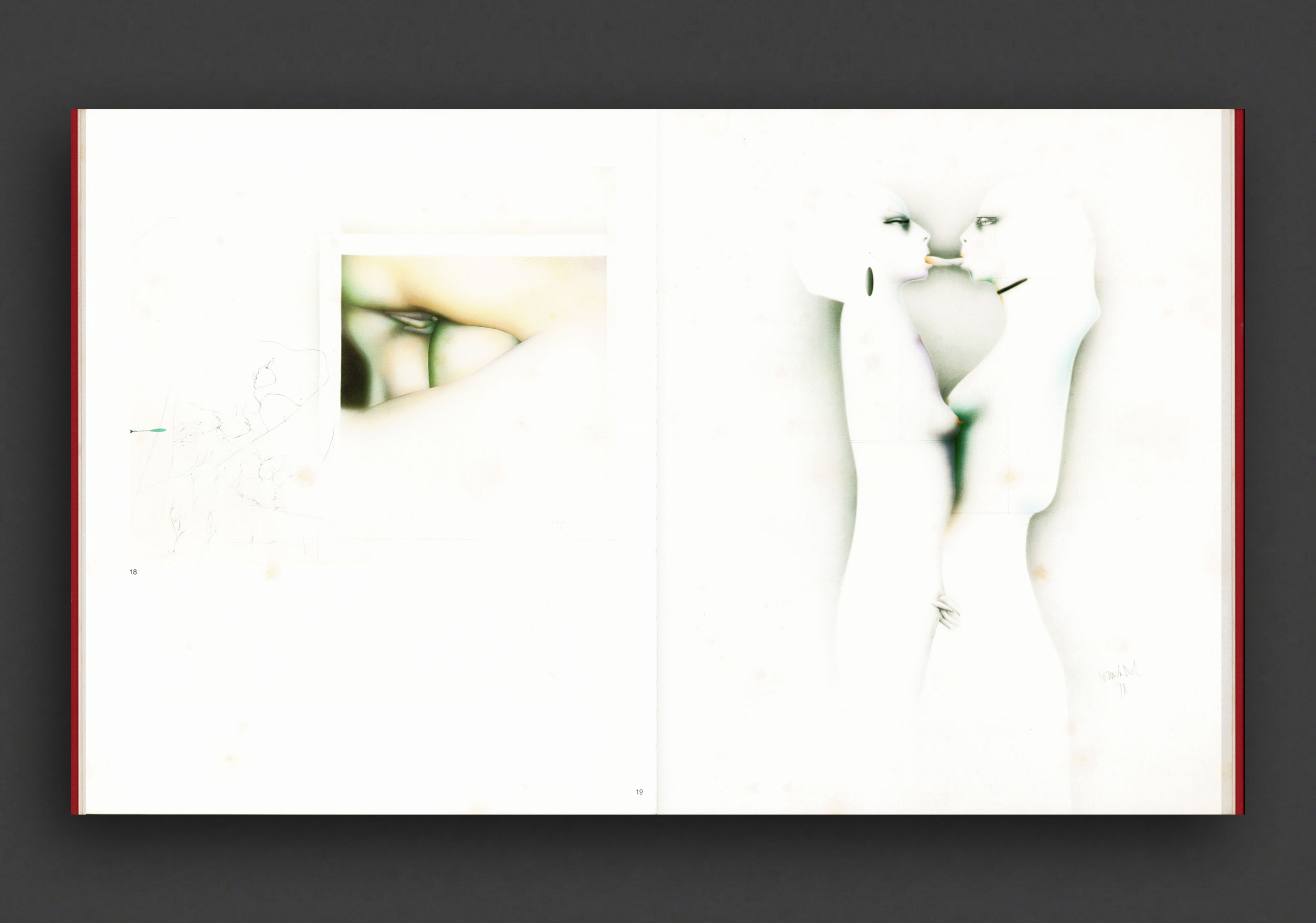 First German 1978 edition of Paul Wunderlich's erotic portfolio "Homo Sum", published by Edition Volker Huber, Offenbach am Main. An lovely over-sized, hardcover edition of 34 full-page drawings housed in hard slipcase with illustrated plate by German painter, sculptor and graphic artist, Paul Wunderlich (1927—2010). Homo Sum is Wunderlich's more explicit works including many same gender male and female scenarios rendered in his iconic airbrush style.